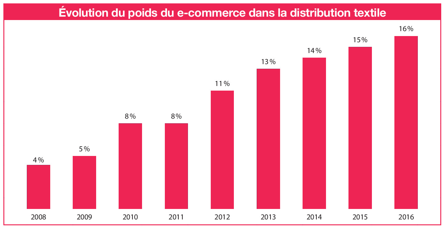 Dans le secteur de l’habillement, le poids du e-commerce dans la distribution textile est passé de 4 % en 2007/2008 à 16 % en 2015/2016 (source Fevad), ce qui représente un marché de 4,4 milliards d’euros en 2016.